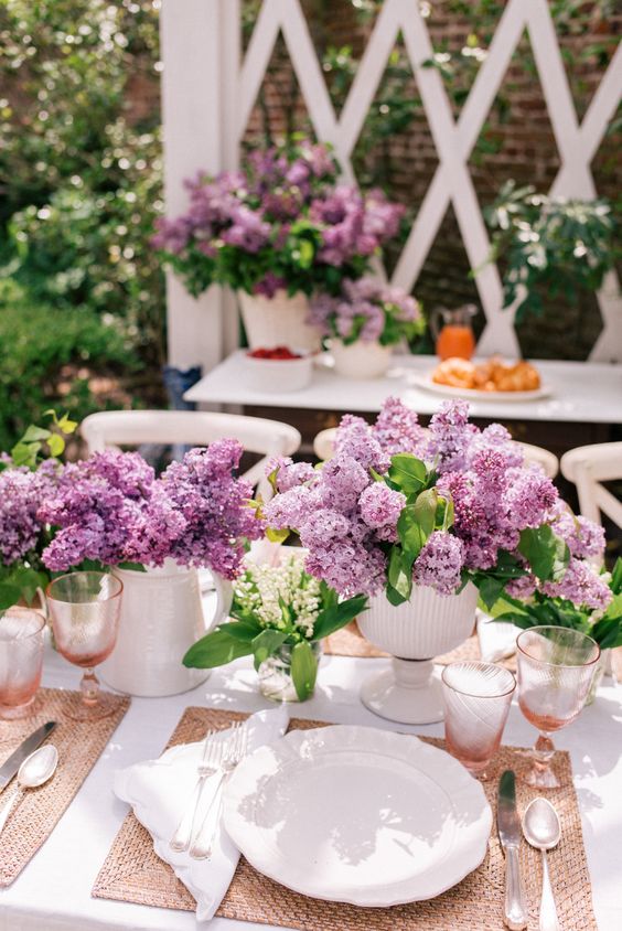 Autre fleur printanière canon en centre de table : le lilas, assez commun puisqu’il s’agit de l’une des valeurs sûres pour avoir un jardin fleuri au printemps.